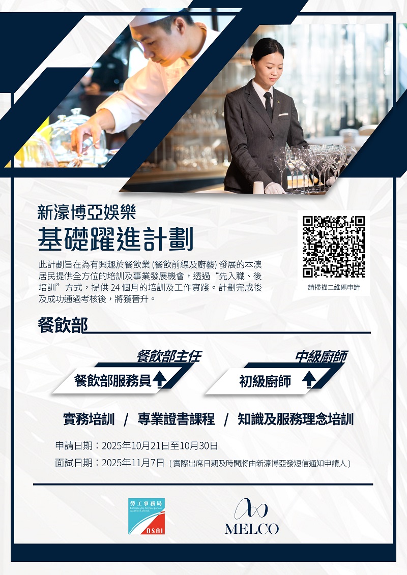 為有興趣於酒店餐飲業發展的本澳居民,提供全方位的培訓及事業發展機會,勞工事務局(下稱“勞工局” )和新濠博亞娛樂有限公司(下稱“新濠博亞”)合作推出“新濠博亞娛樂基礎躍進計劃—餐飲部”(下稱“計劃” ),以“先入職、後培訓”方式,為有興趣從事酒店餐飲業範疇的本澳居民,提供事業發展機會,計劃由10月21日起接受申請。