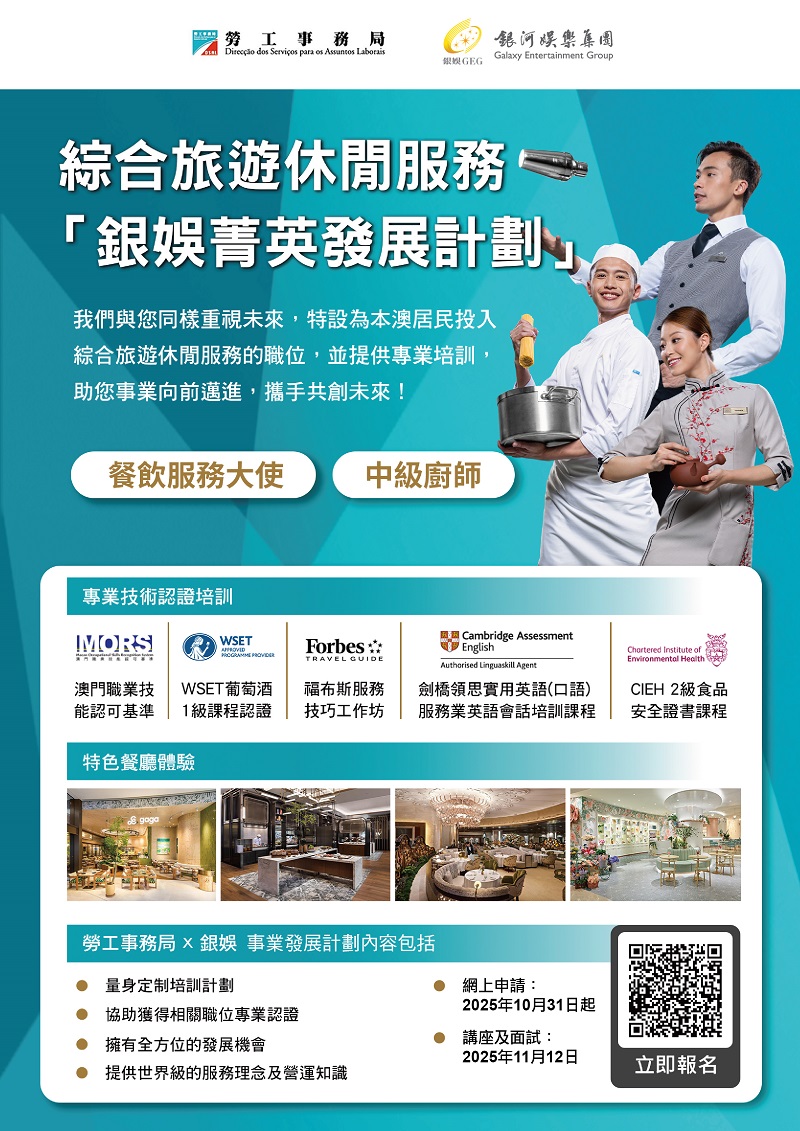 為支持本地人才全面發展,拓展多元職涯路向,勞工事務局(下稱“勞工局”)和銀河娛樂集團(下稱“銀娛”)合作推出“銀娛菁英發展計劃(餐飲營運及廚藝)”(下稱“計劃”),以先入職、後培訓方式,為有志投身綜合旅遊休閒服務行業的澳門居民,提供一系列餐飲及廚藝的專業培訓及工作實踐機會,計劃(31)日起接受申請。