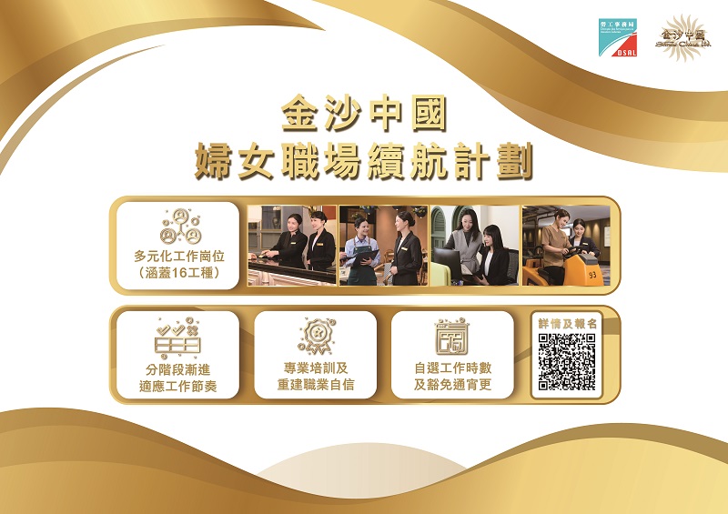 為協助因照顧家庭或個人原因離開職場的婦女,逐步重建職業能力與信心,順利續航職場,勞工事務局(下稱“勞工局")和金沙中國有限公司(下稱“金沙中國")合作推出“金沙中國婦女職場續航計劃"(下稱“計劃")。是次計劃將結合小組支援、專業培訓、工作實踐以及彈性工作時數安排等措施,讓已離開職場的婦女,逐步適應工作環境,續航職場。有意參加者可於明(6)日起至1月16日期間網上遞交申請。