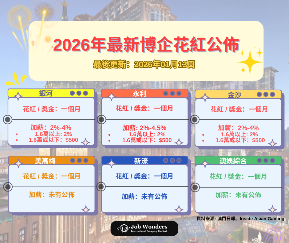 (1月7日公佈) 銀娛將於2026年2月9日向合資格團隊成員發放相等於一個月基本月薪及保證小費(如適用)的酌情花紅,約有97%團隊成員受惠。