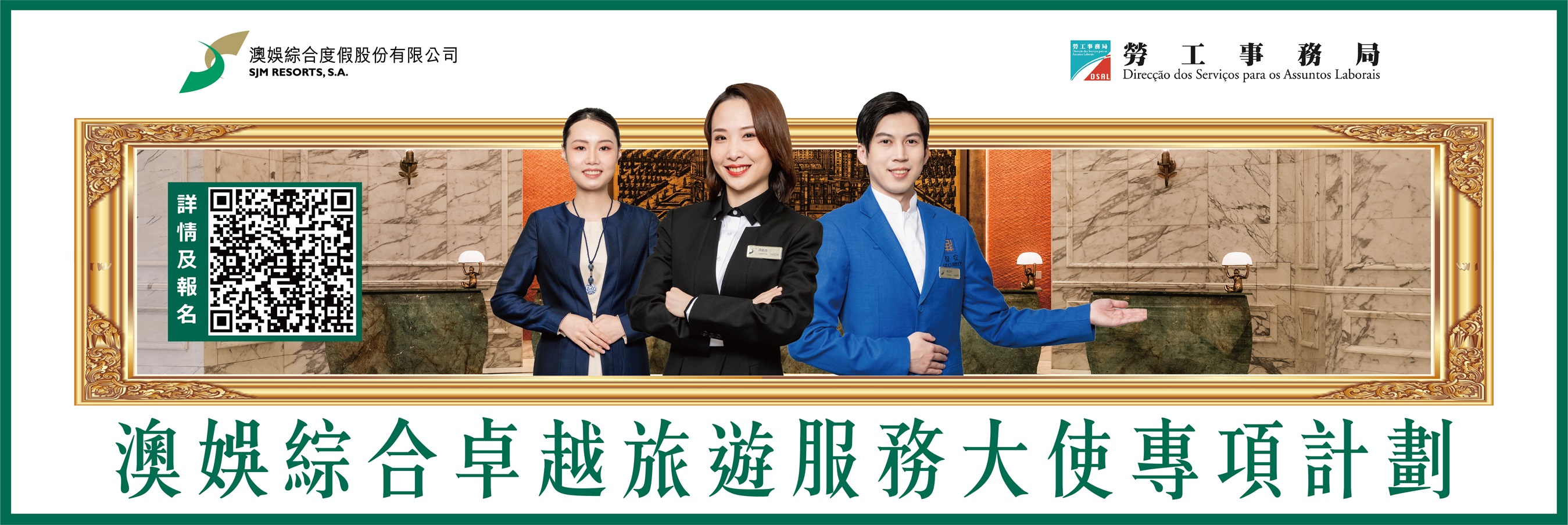 電話:(853)8297 0975 (澳娛綜合人才招募熱線 盧先生),或(853)8399 9856 (勞工局 關先生)。
