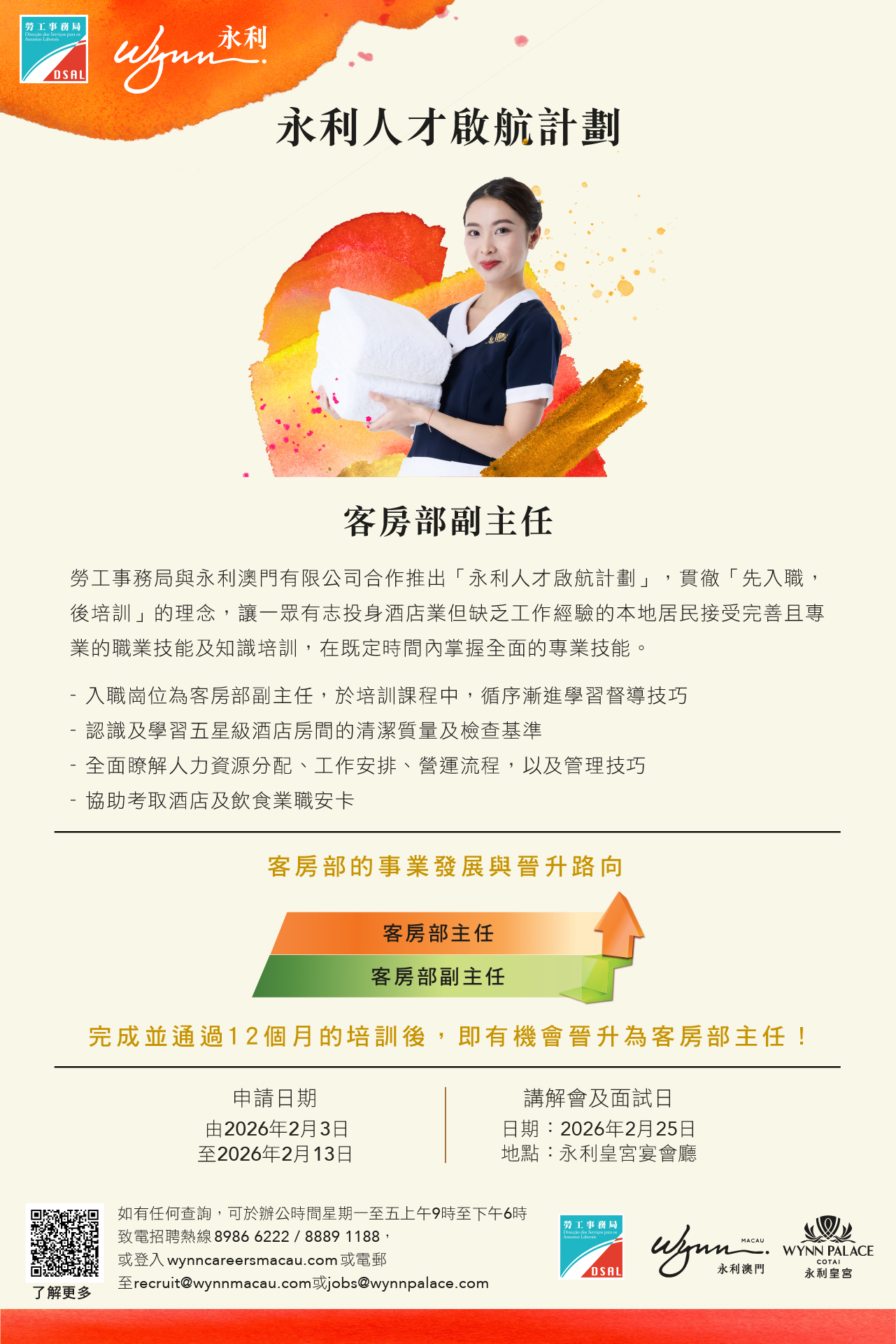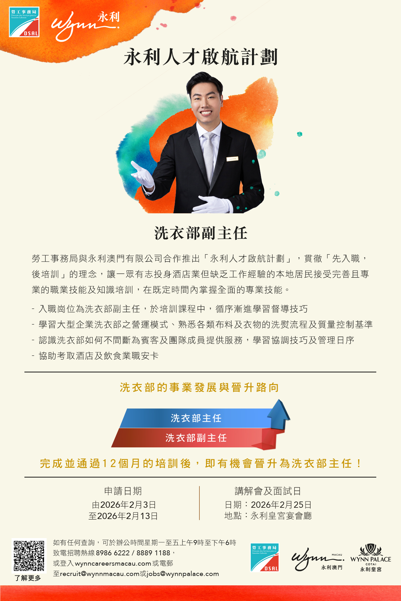 為培育本地人才,助力提升澳門綜合旅遊休閒產業的國際競爭力,勞工事務局(下稱勞工局)與永利澳門有限公司(下稱永利)合作推出永利人才啟航計劃,透過先入職,後培訓方式,提供一系列的專業培訓及工作實踐。計劃完成後,視乎考核結果及個人表現,可晉升至客房部主任、公眾衛生部主任或洗衣部主任。