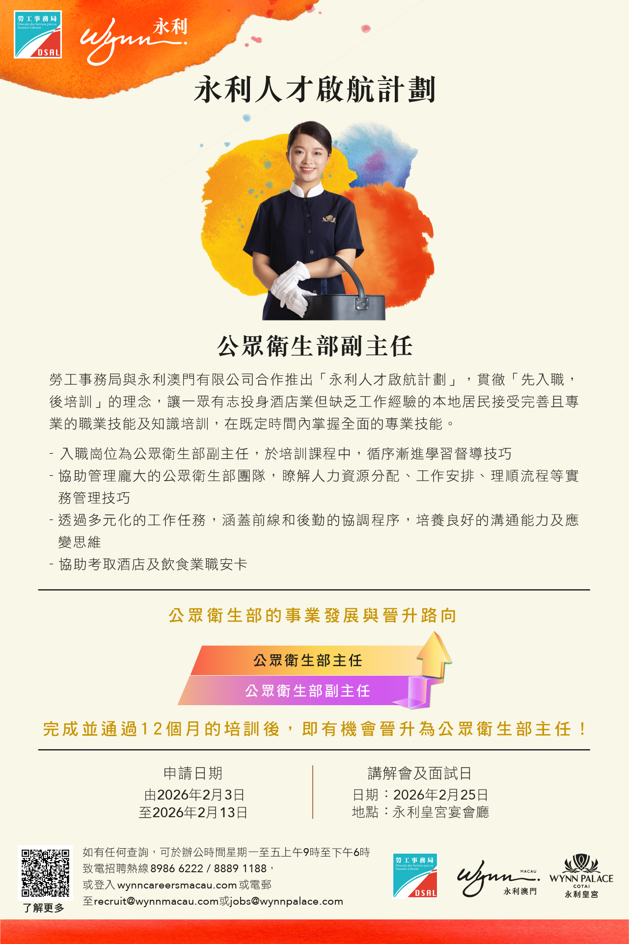 電話:(853)8986 6222 (永利招聘熱缐 朱小姐),或(853)8399 9885 (勞工局 鄭小姐)。