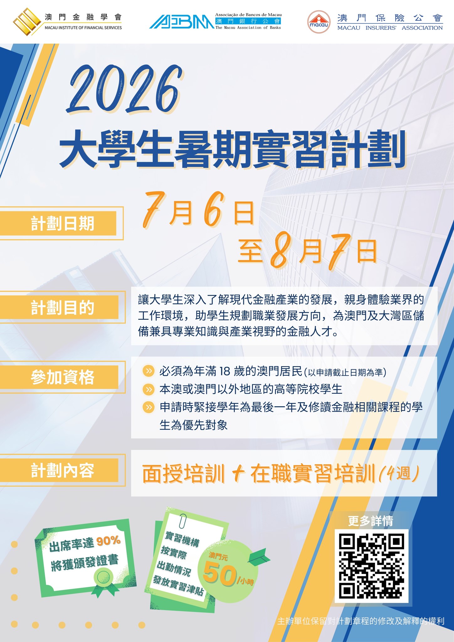 由澳門金融學會、澳門銀行公會及澳門保險公會聯合舉辦的「大學生暑期實習計劃2026」正式啟動,誠邀有意投身金融業的澳門大專學生參加,親身體驗行業實況,為履歷增添亮眼一筆!
