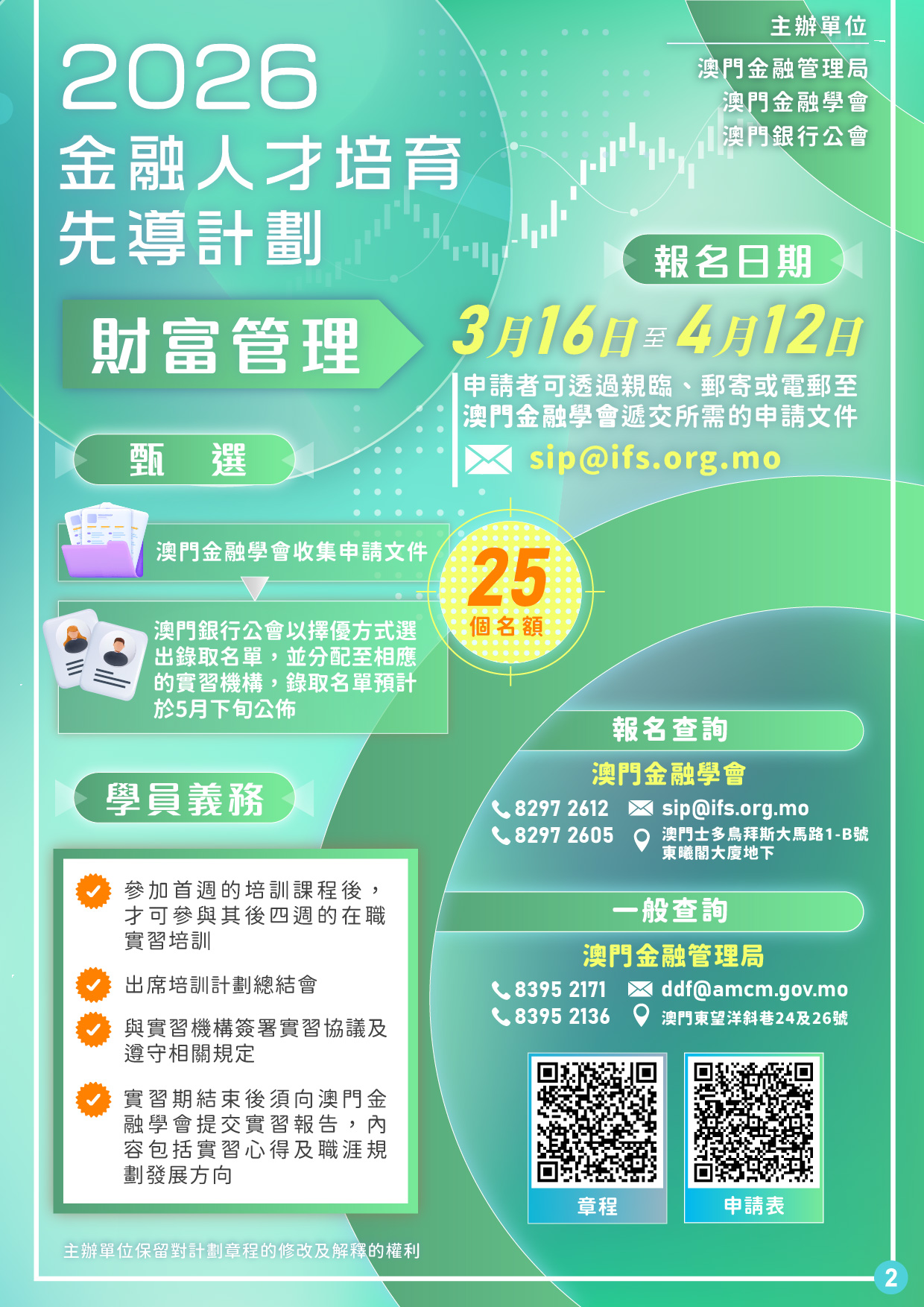 先導計劃報名期由3月16日至4月12日,對象為正在修讀金融相關專業、有志從事財富管理業務的大專院校學生,且必須為年滿18歲的澳門居民。合資格且有興趣的學生可於上述期間透過澳門金融學會報名。主辦單位將甄選25名學生參加計劃,錄取名單預計於5月下旬公佈。