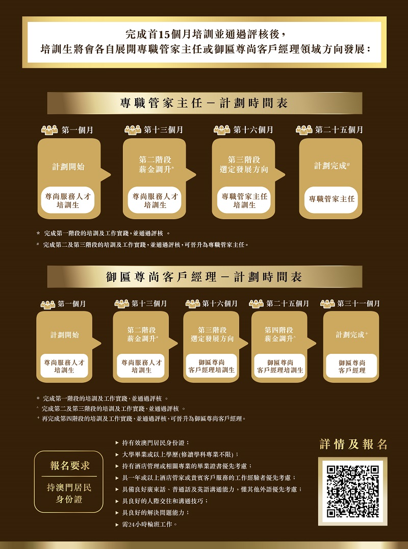 該計劃提供12個“尊尚服務人才培訓生"職位空缺,獲計劃錄取者將由金沙中國安排接受專業培訓及工作實踐,在完成首15個月培訓及通過考核後,獲錄取者可按個人意願及部門評估,選定以“專職管家主任”或“御匾尊尚客戶經理”作為後續發展方向。選擇“專職管家主任”者需接受餘下9個月的培訓;選擇“御匾尊尚客戶經理”者則需完成餘下15個月培訓。