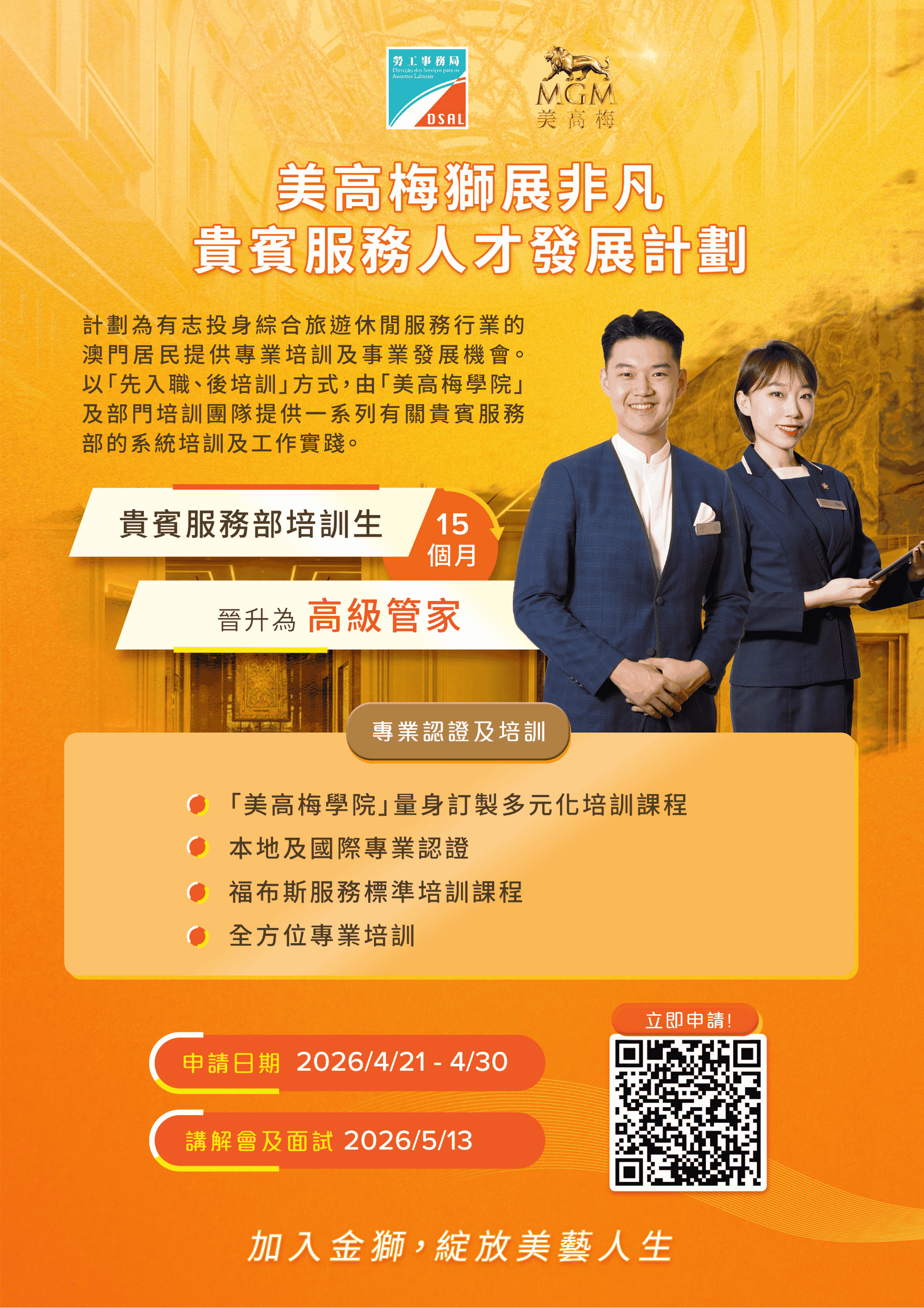 如欲了解計劃詳情,可瀏覽勞工局網站內相關專頁: https://www.dsal.gov.mo/zh_tw/standard/mgm2026_pg1.html,有意參加者可於明(21)日起至4月30日期間遞交網上申請。申請期結束後,美高梅將陸續通知符合條件的申請人出席5月13日舉行的講座及隨即安排面試,並向出席者詳細說明計劃的各項培訓內容及職業生涯發展路徑。