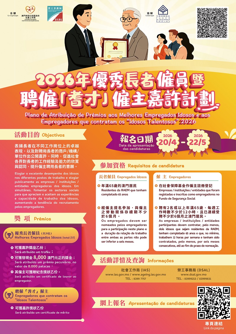 為表揚長者在不同工作崗位上的卓越表現,及對聘用長者僱員的商戶、機構或單位作出公開嘉許,藉以促進社會各界對長者就業能力的認同,為長者提供更多的就業機會。由勞工事務局(下稱“勞工局")與社會工作局(下稱“社工局")合辦、社會保障基金協辦的“2026年優秀長者僱員暨聘僱「耆才」僱主嘉許計劃”於4月20日至5月22日接受提名。