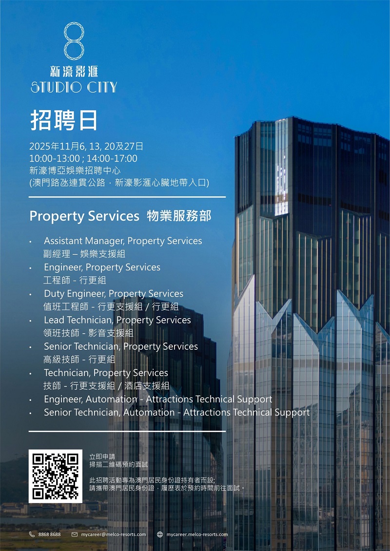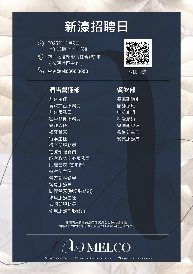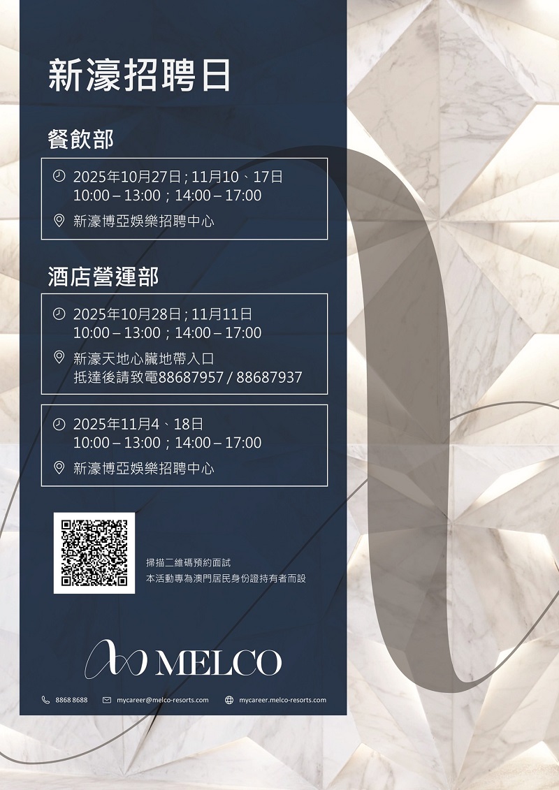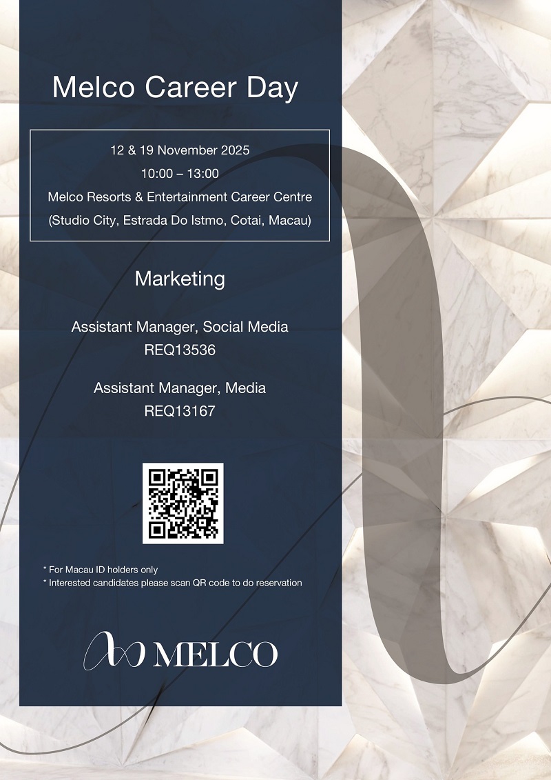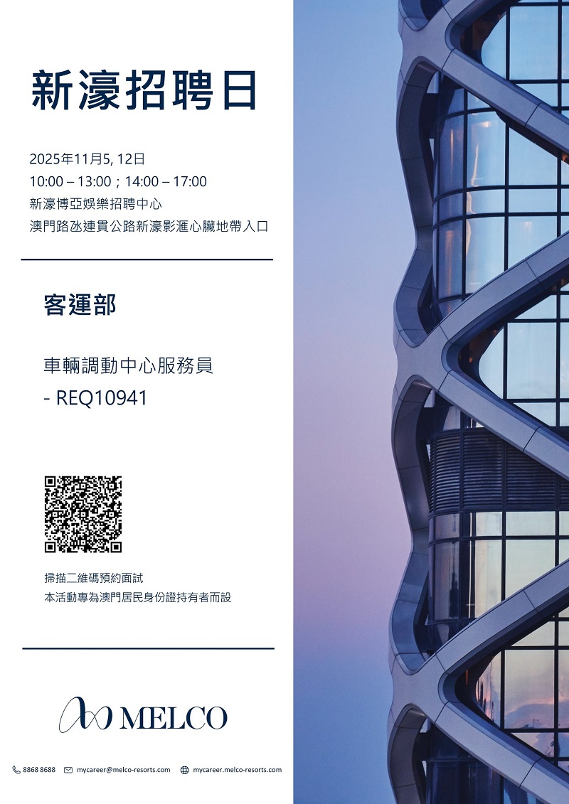 此招聘活動專為澳門居民身份證持有者而設; 請攜帶澳門居民身份證,履歷表於預約時間前往面試。