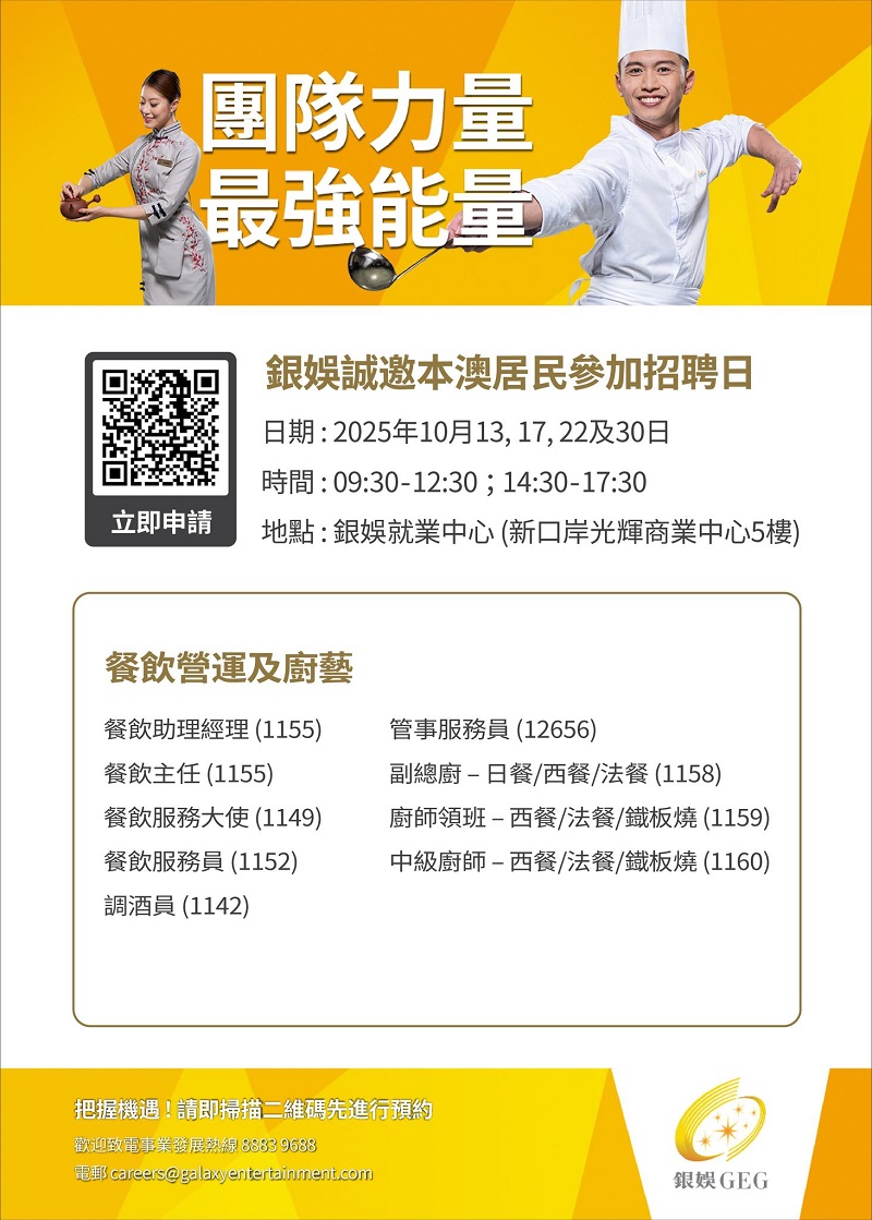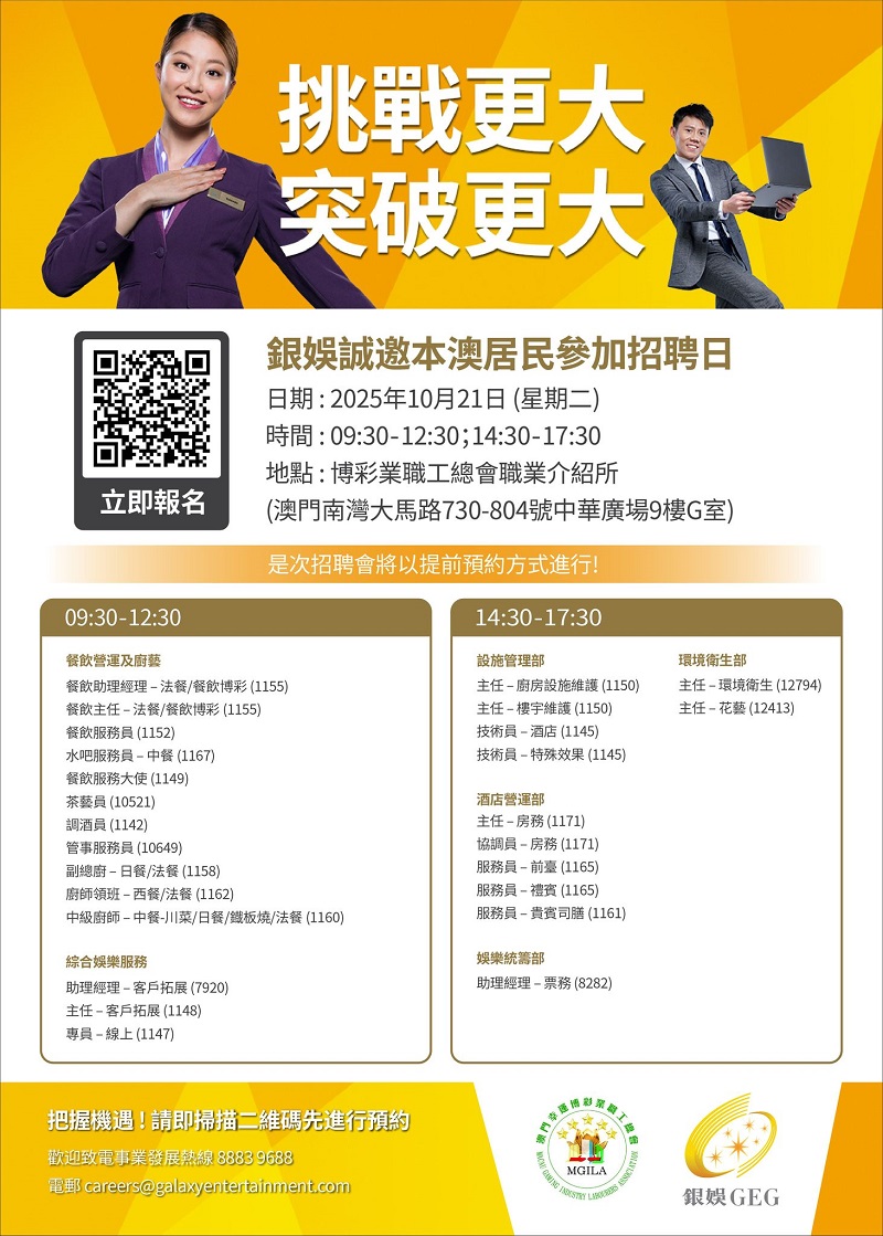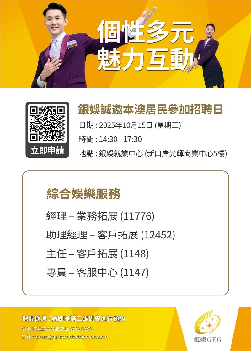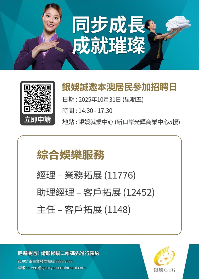 誠邀本澳居民積極參與,切勿錯失良機,為自己的事業揭開新一頁。