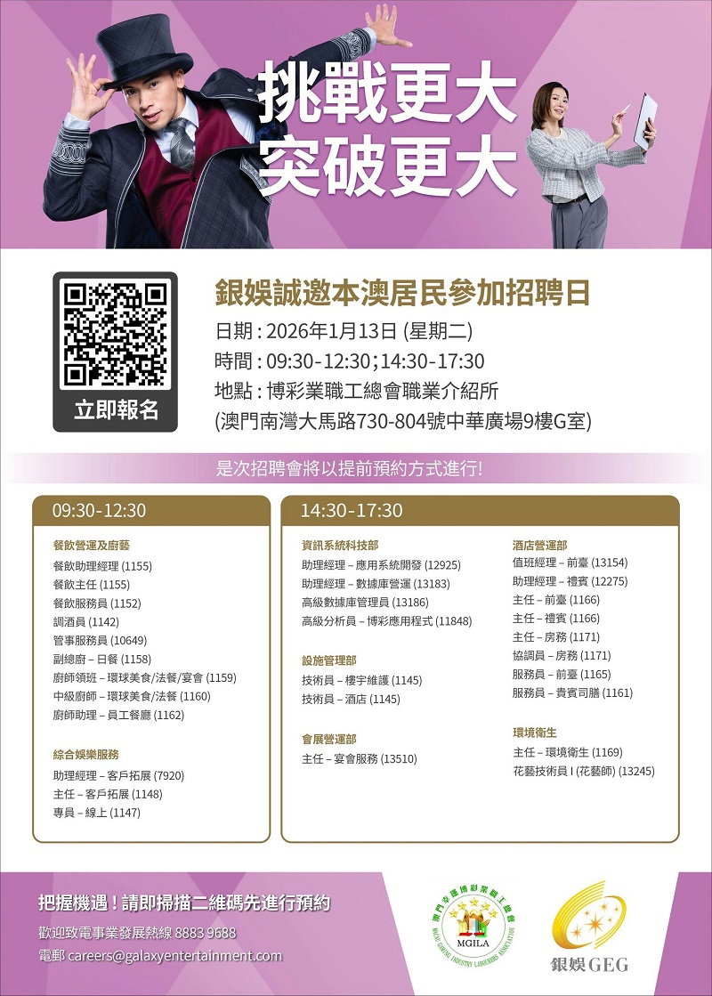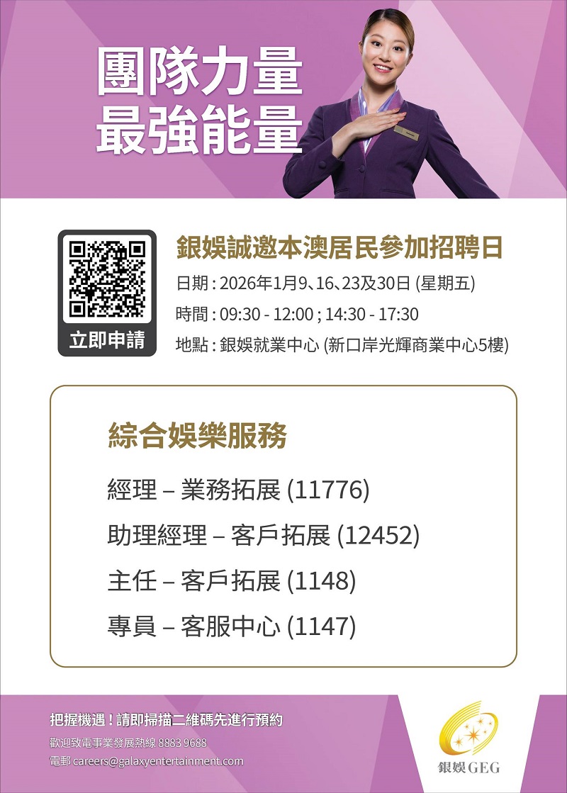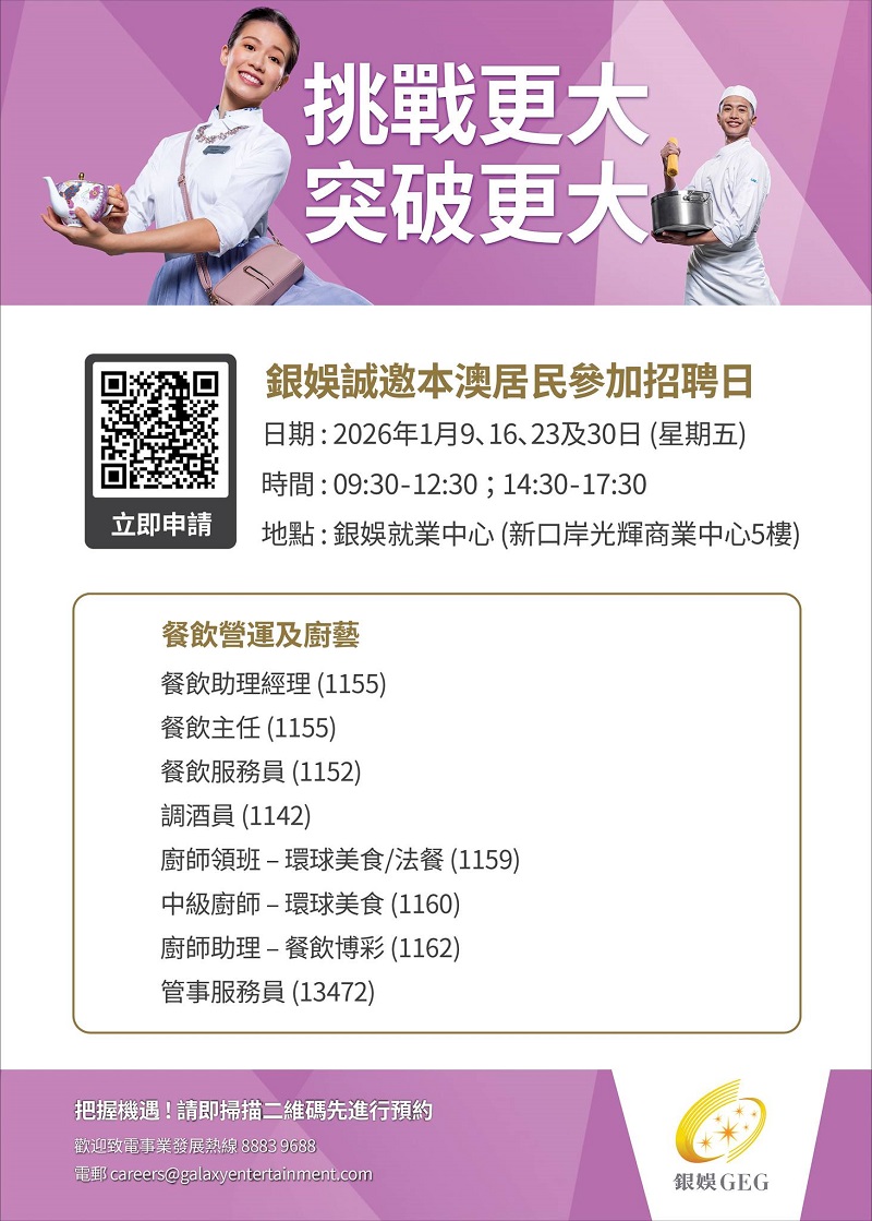 誠邀本澳居民積極參與,切勿錯失良機,為自己的事業揭開新一頁!