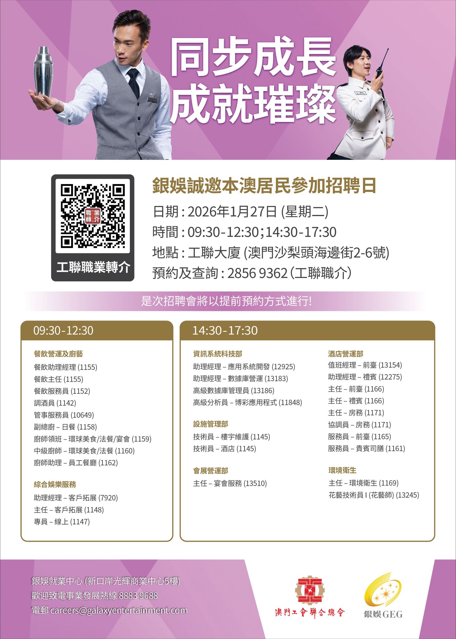 銀河娛樂與工聯合辦招聘日,誠邀本澳居民積極參與,把握機會,切勿錯失良機,為自己的事業揭開新一頁!