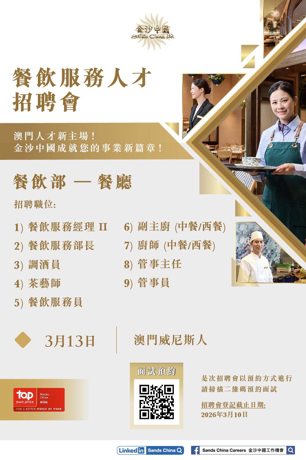 金沙中國招聘專場系列 - 餐飲部 (3月13日)