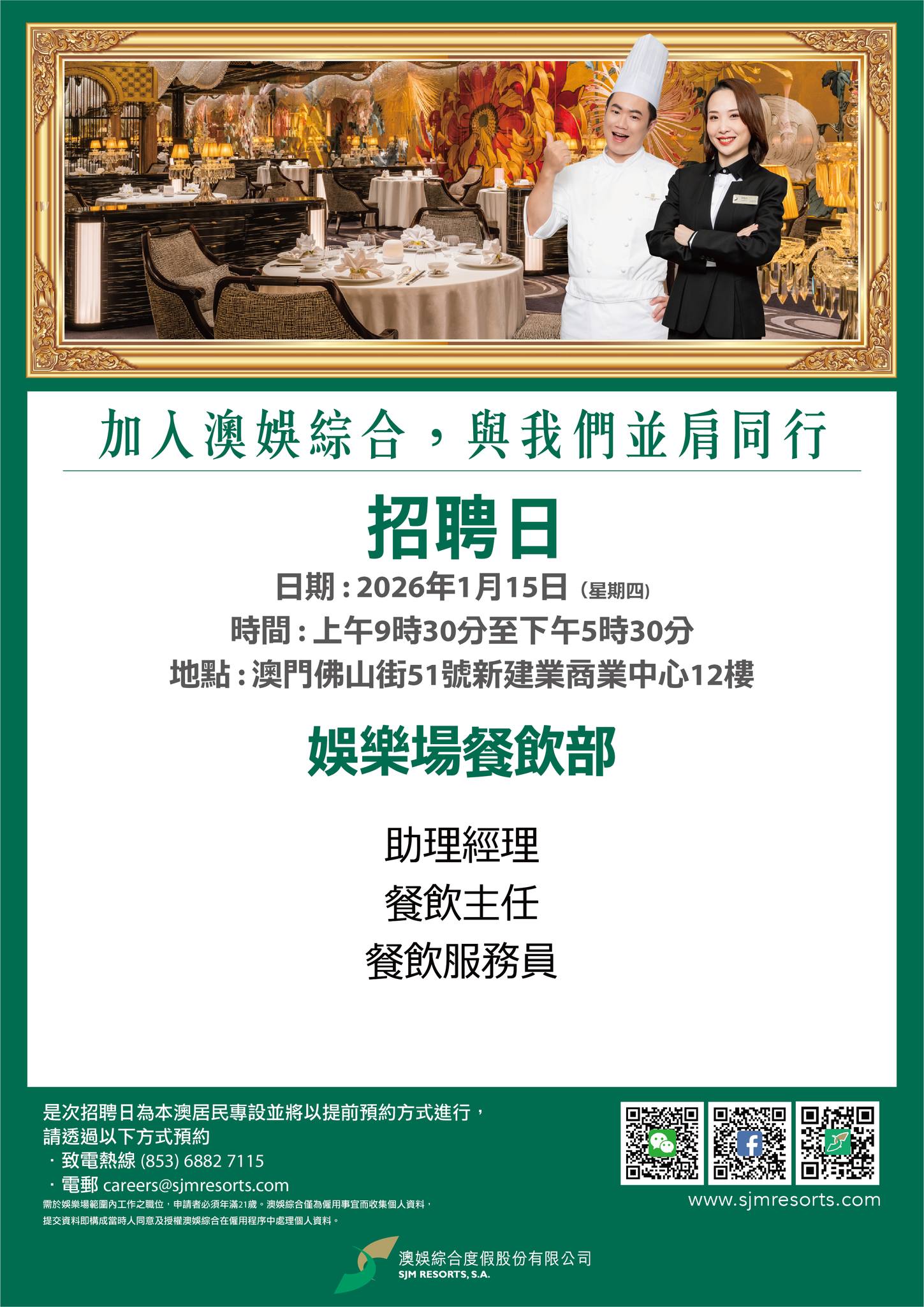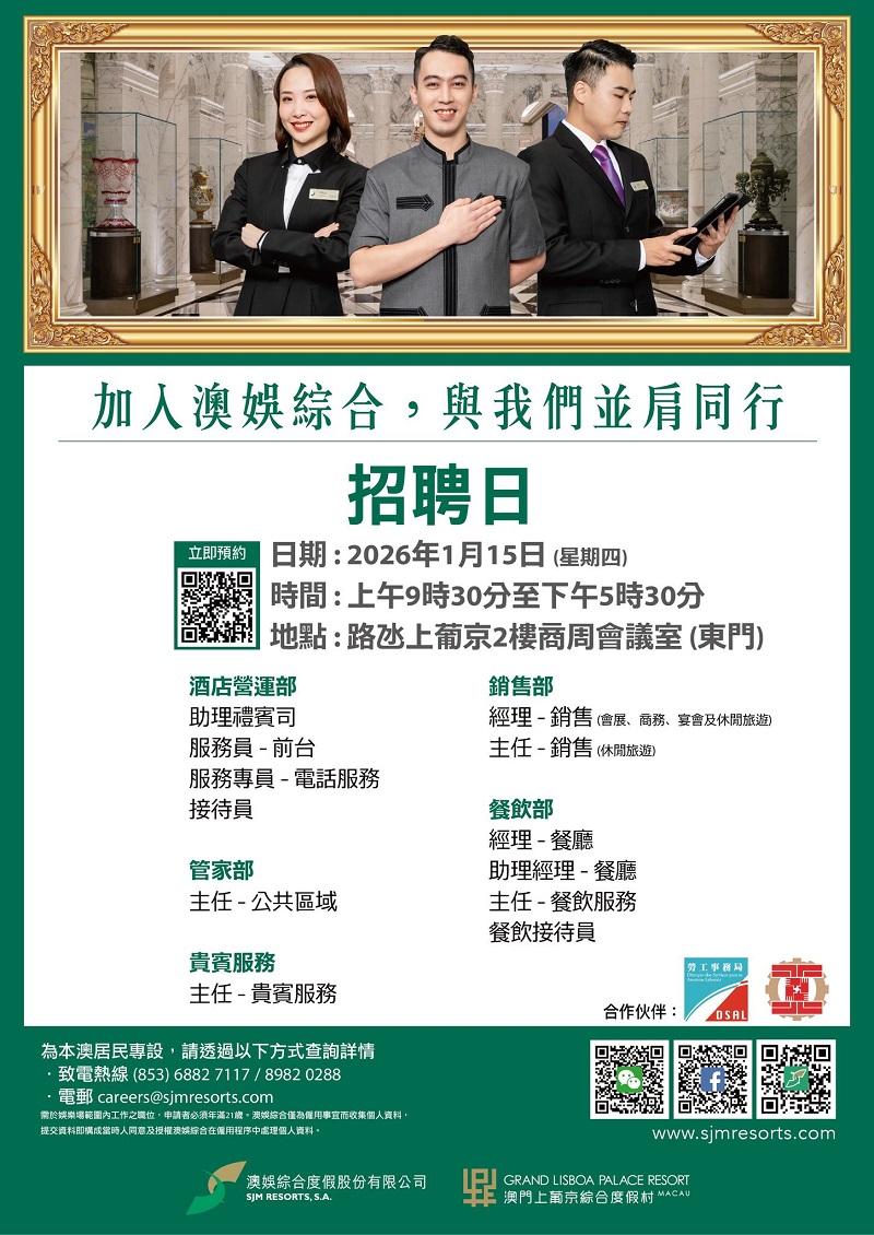 或電郵至careers@sjmresorts.com查詢或預約面試。