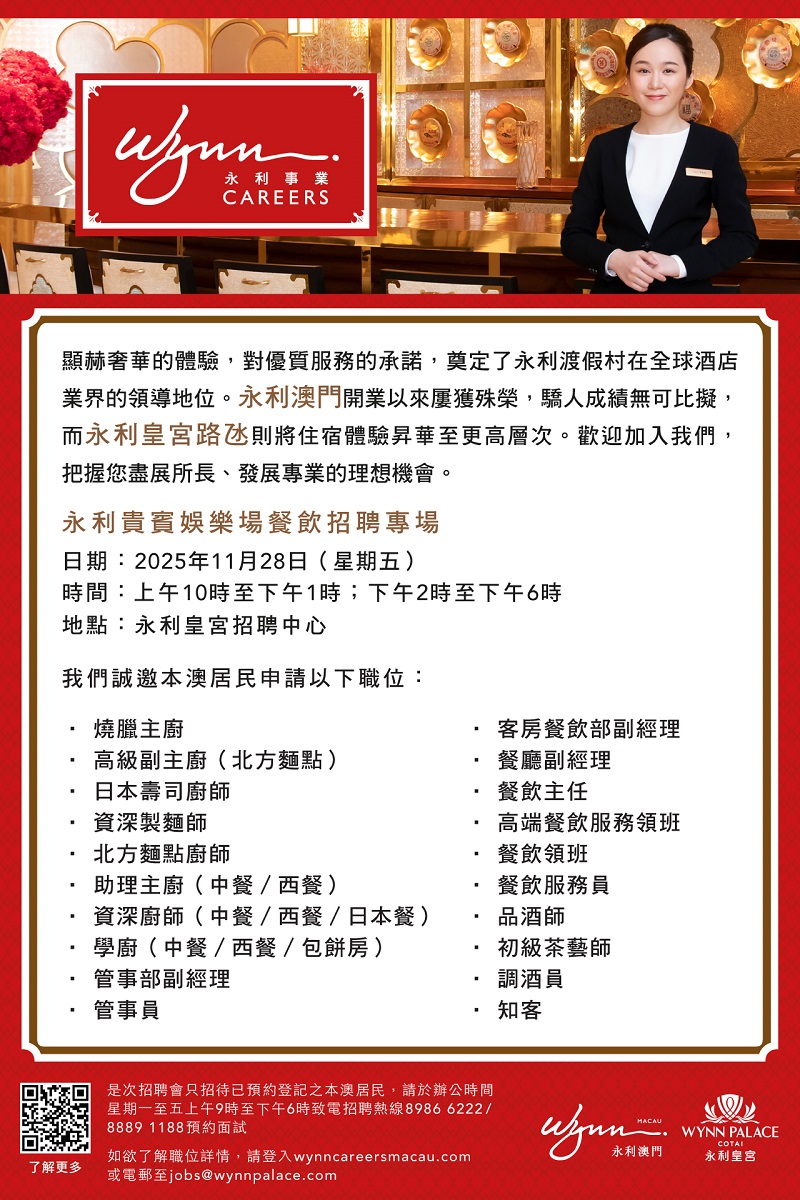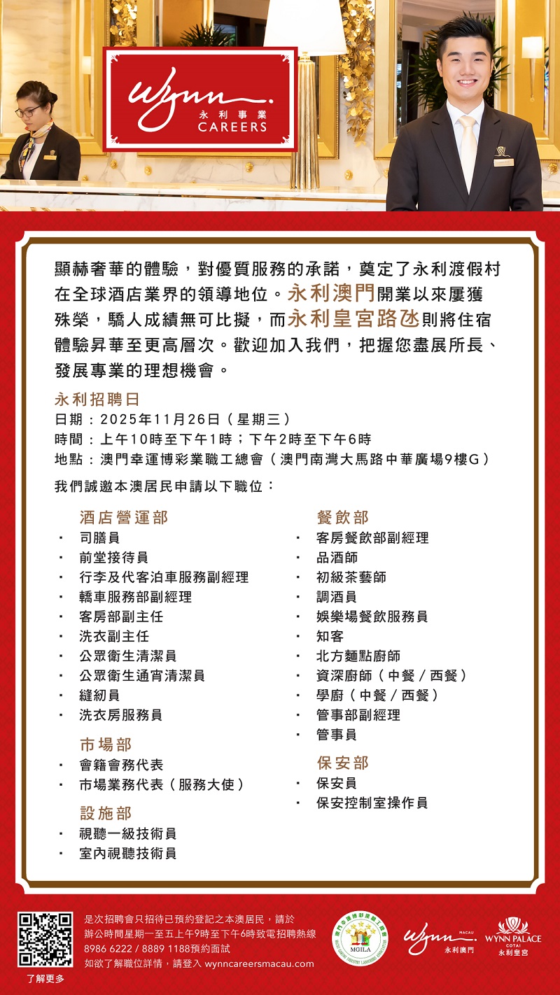 永利澳門 及 永利皇宮招聘日 (2025年11月)