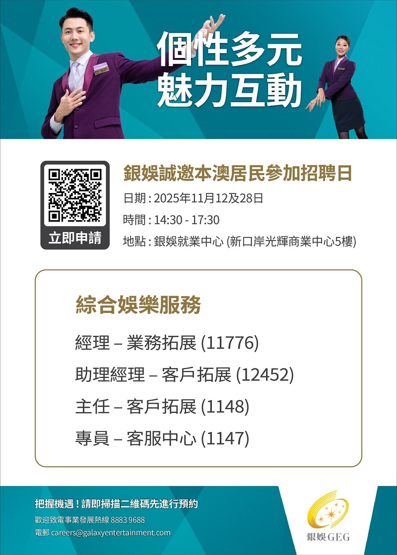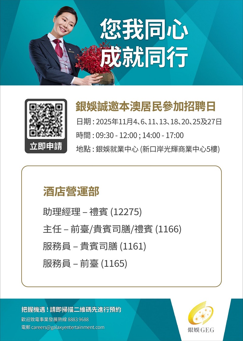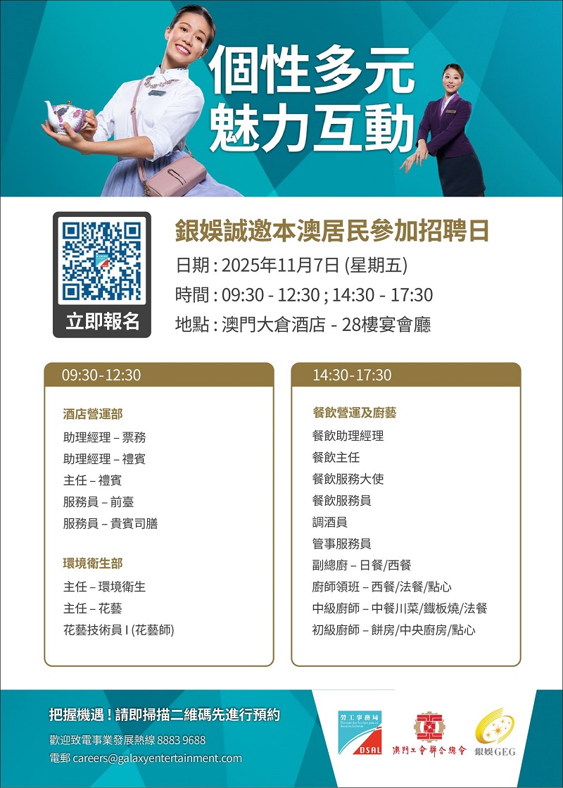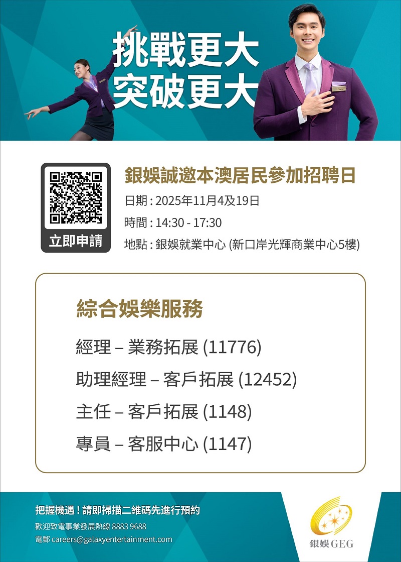 銀娛與澳門勞工事務局合辦本澳居民專屬公開招聘日,誠邀本澳居民積極參與,切勿錯失良機,為自己的事業揭開新一頁!
