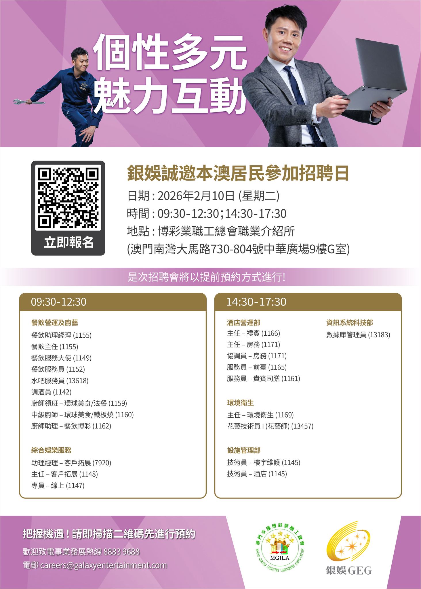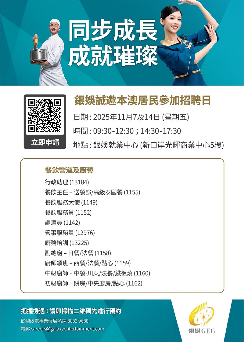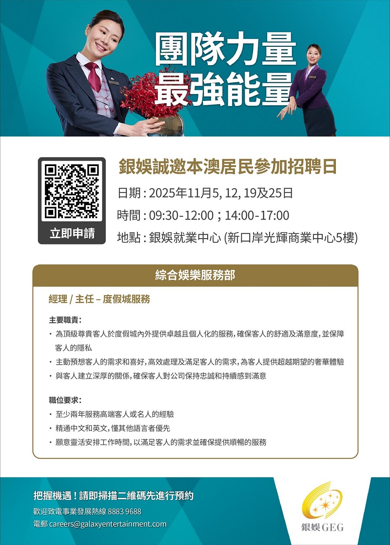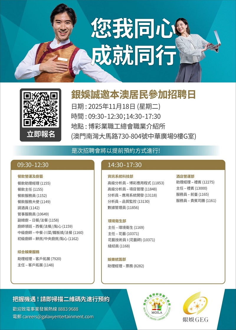 銀娛與澳門勞工事務局合辦本澳居民專屬公開招聘日,誠邀本澳居民積極參與,切勿錯失良機,為自己的事業揭開新一頁!