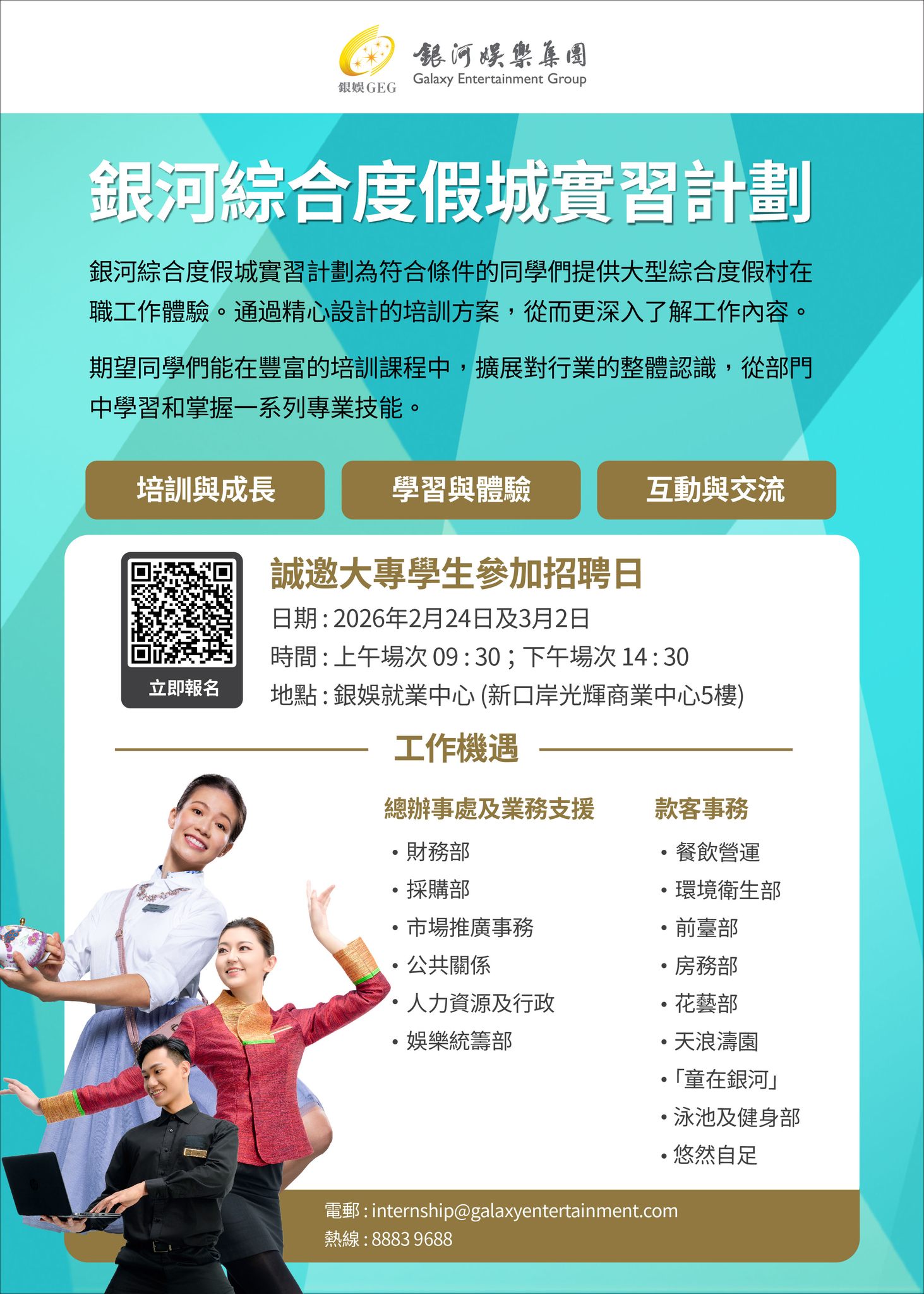 銀娛將舉辦實習計劃招聘日,誠邀有興趣大專學生參與。把握實習機會,讓自己畢業後成為有經驗的社會新鮮人。