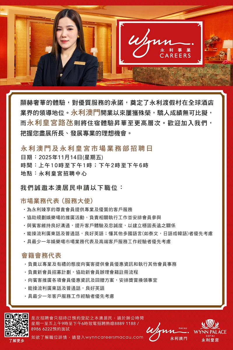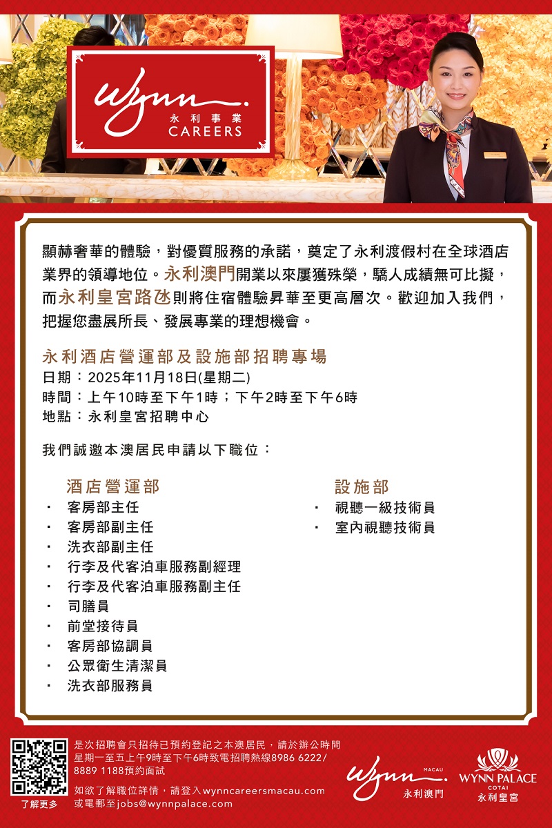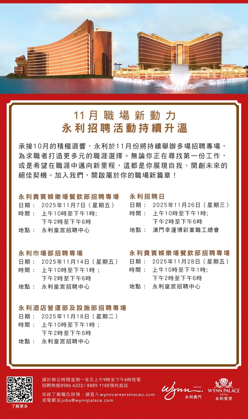 永利澳門 及 永利皇宮招聘日 (2025年11月)